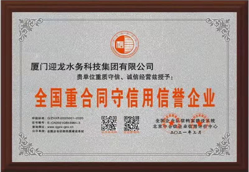 厦门迎龙水务科技集团有限公司是上海迎隆水务工程设备(集团)有限公司全资子公司,注册资金8666万元,是集研发、生产、销售、安装钢塑复合水箱、不锈钢水箱、箱泵一体化、BDF地埋式水箱、变频恒压给水设备于一体的综合性供水公司。公司通过ISO9001:2015标准认证,同时获得福建省卫生厅颁发“卫生许可批件”“福建省疾病预防控中心的检测报告”以及荣获“中国驰名品牌”“中国百强优秀企业”“中国高新技术企业”“全国给排水行业十大著名品牌”“国家权威检测质量合格产品”“质量.服务.诚信AAA企业”"科技型中小企业”等荣誉,并且获得多项行业专利,在国内外有较高的知名度。